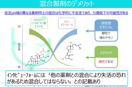 おはようございます やなせです。 昨日、お昼からとある製剤の全国講演を発信させていただき 以下の筆者作成スライドですが ステロイドとVitD3との混和は速やかに失活する 「夫婦関係と一緒で、それぞれ得意分野が異なる (その効果発揮はpH(ペーハー)により…