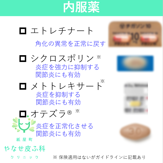 エトレチナートは催奇形性があるため妊娠は禁忌で、また小児には骨症状、口唇炎などの合併症があります。シクロスポリンは高血圧と腎障害、悪性腫瘍に注意。MTXも肝腎機能障害やなど禁忌が多いです。オテズラは胃腸障害でしょうか。